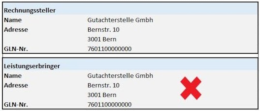 - Der «Rechnungssteller» muss nicht mit dem Leistungserbringer identisch sein. Es kann sich dabei um eine natürliche oder um eine juristische Person handeln (Ärztin / Arzt, Arztpraxis, Klinik, Spital, Unternehmen, Stiftung, Drittrechnungssteller usw.). Unter der Rubrik «Rechnungssteller» müssen der Name und der Vorname (gegebenenfalls auch der Firmenname des Einzelunternehmens oder der Gesellschaft), die Adresse und die GLN des Rechnungsstellers angegeben werden.
