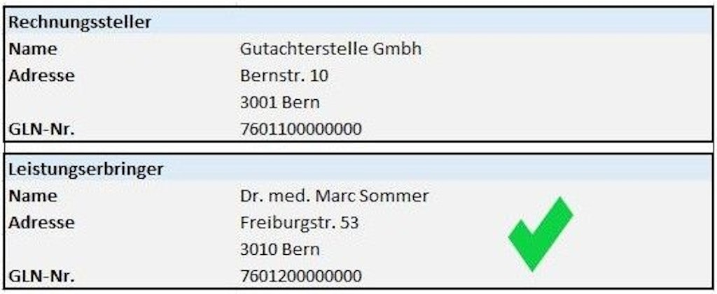 - Unter der Rubrik «Leistungserbringer» müssen der Vorname/Name, die Adresse und die Global Location Number (GLN) der Ärztin / des Arztes angegeben werden, die/der das Gutachten erstellt hat. Der Leistungserbringer ist immer eine natürliche Person (keine Arztpraxis, keine Klinik, kein Spital, kein Unternehmen und keine Stiftung).