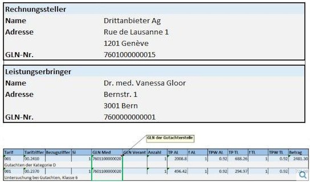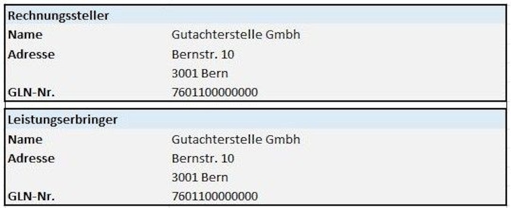 - Ist die zugelassene Gutachterstelle der Rechnungssteller, so müssen unter der Rubrik «Rechnungssteller» der Firmenname, die Adresse und die GLN der Gutachterstelle angegeben werden.