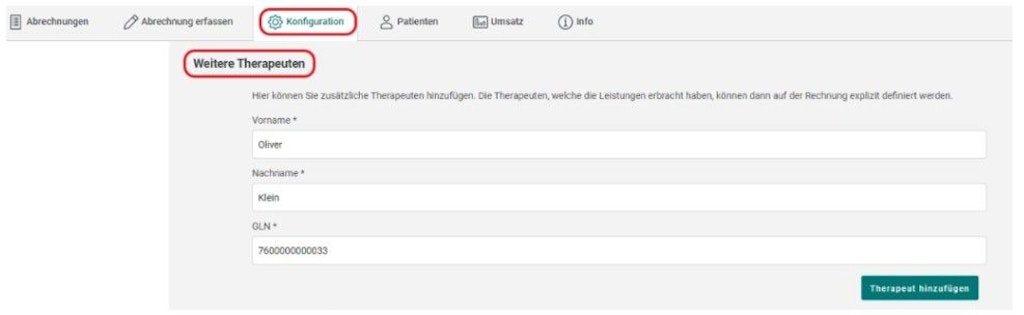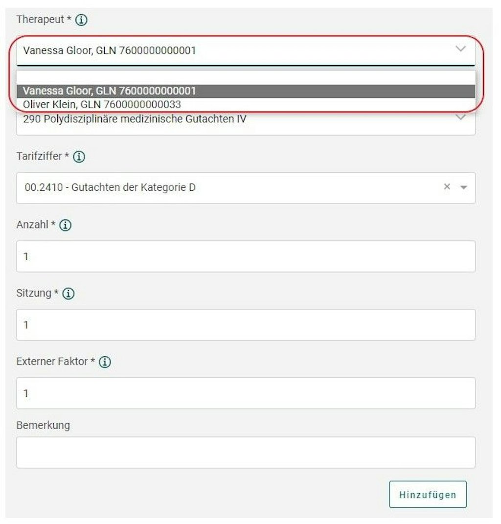 Um die zweite Ärztin / den zweiten Arzt mit ihrer/seiner GLN anzugeben, muss sie/er nach der Registrierung im Teil «Weitere Therapeuten» im betreffenden Formular ausgewählt werden.