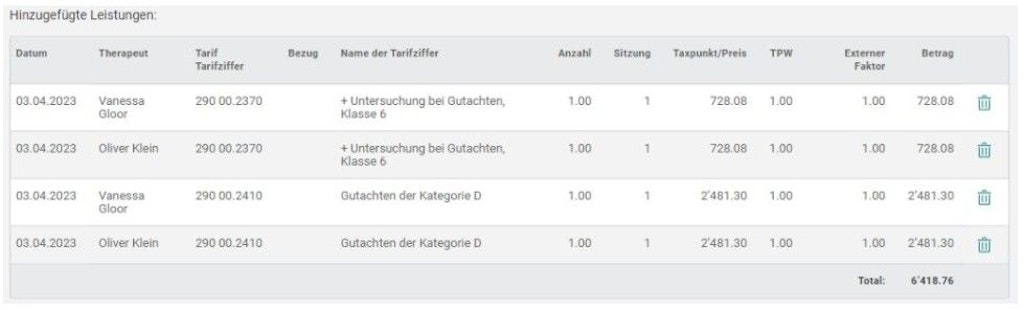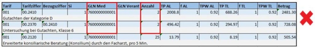 - Bei den auf der Rechnung angegebenen Leistungen müssen die Tarifcodes, die Tarifziffern sowie die Beträge angegeben werden.