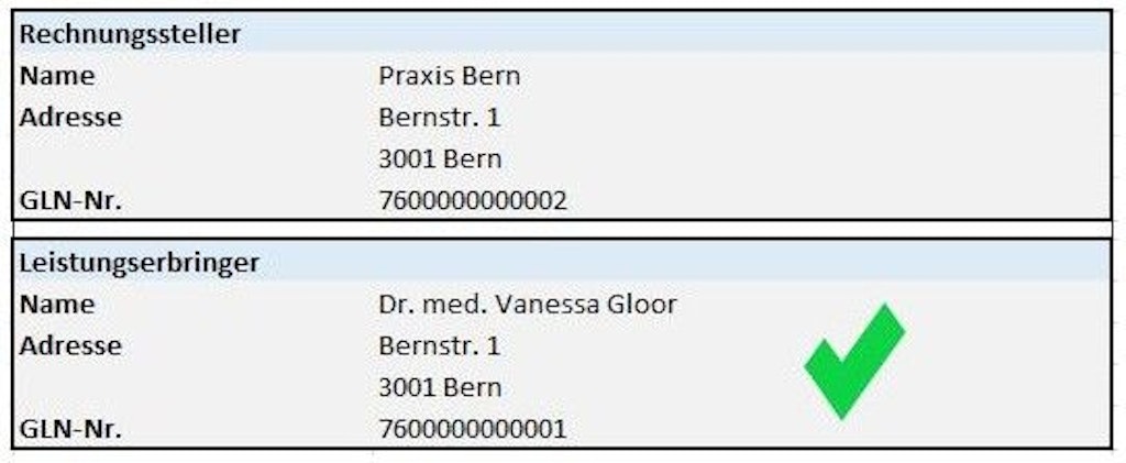 - Unter der Rubrik «Leistungserbringer» müssen der Vorname/Name, die Adresse und die Global Location Number (GLN) der Ärztin / des Arztes angegeben werden, die/der gemäss der Vereinbarung mit dem BSV das Sachverständigen-Zweierteam repräsentiert.