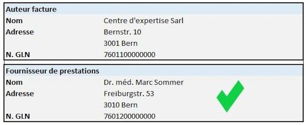 - Dans la rubrique « fournisseur de prestations » doivent être indiqués les prénom/nom, l’adresse et le GLN du médecin ayant réalisé l’expertise. Le fournisseur de prestations est toujours une personne physique.