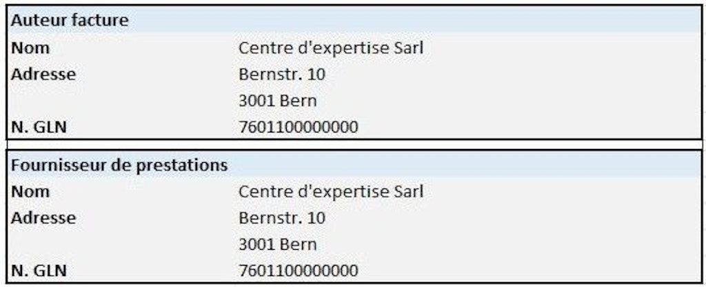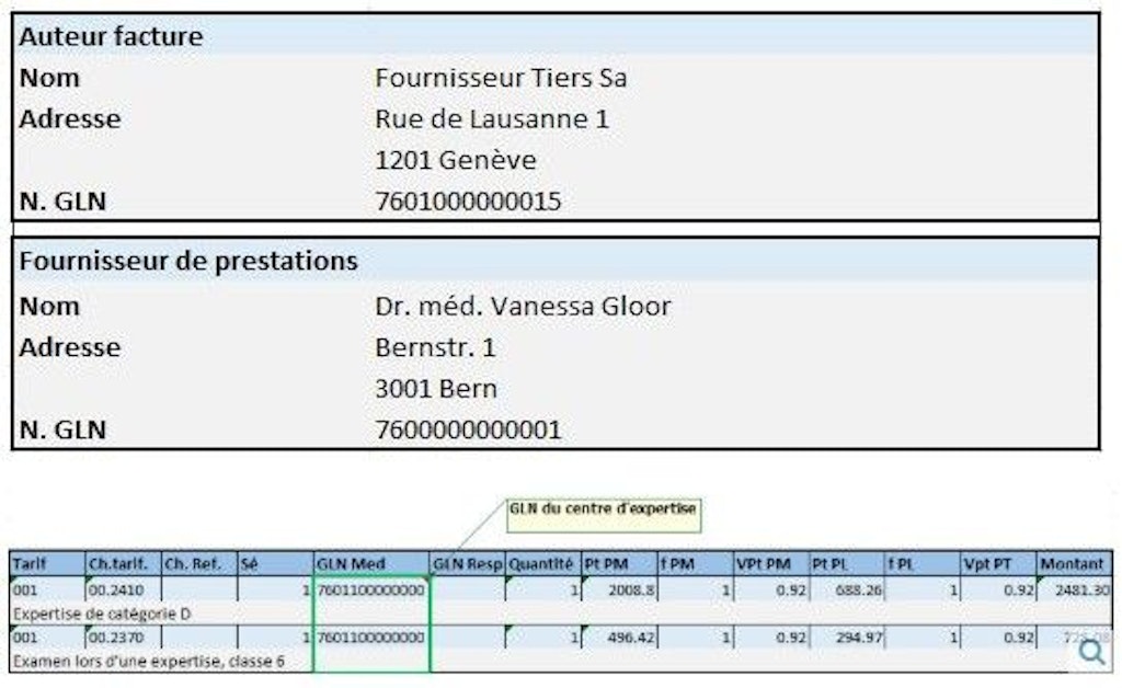 - Dans la rubrique « auteur de la facture » doivent être indiqués la raison sociale, l’adresse et le Global Location Number (GLN) du centre d’expertises accrédité par l’OFAS ayant reçu le mandat.