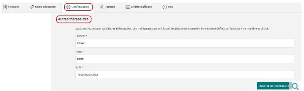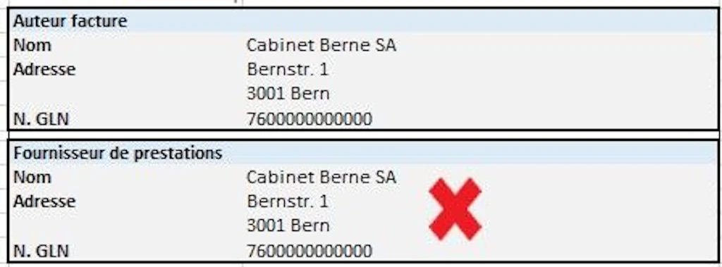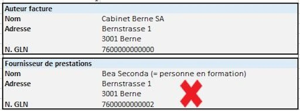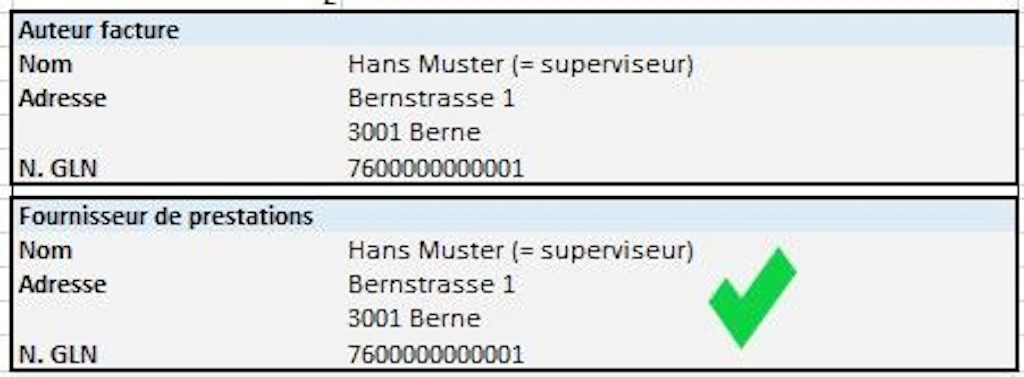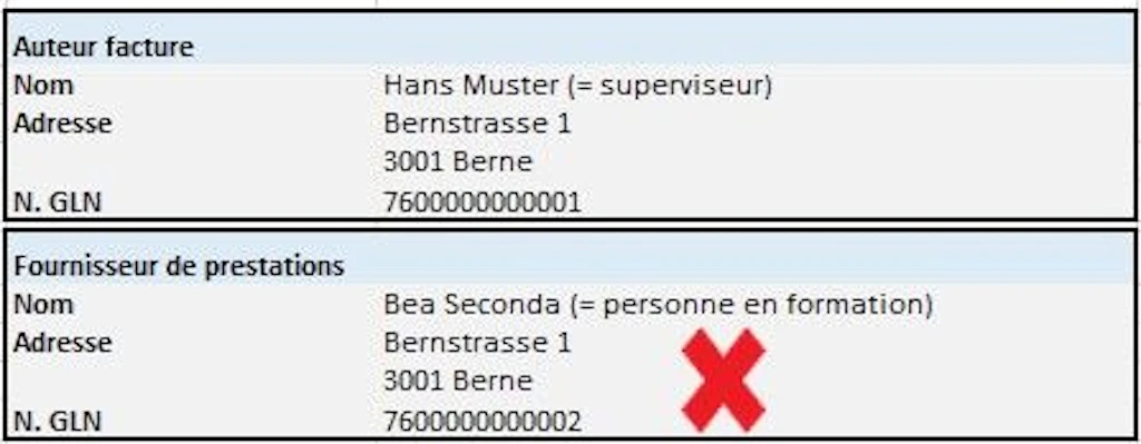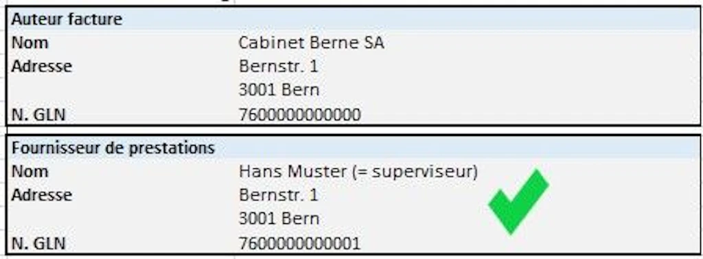 - Si le spécialiste qui les encadre est employé par une institution, c’est cette dernière qui facture les prestations. Dans ce cas, le nom et le numéro GLN du superviseur figurent explicitement sur chaque facture en tant que «Fournisseur de prestations». Quant à l’institution, elle doit y figurer comme «Auteur facture».