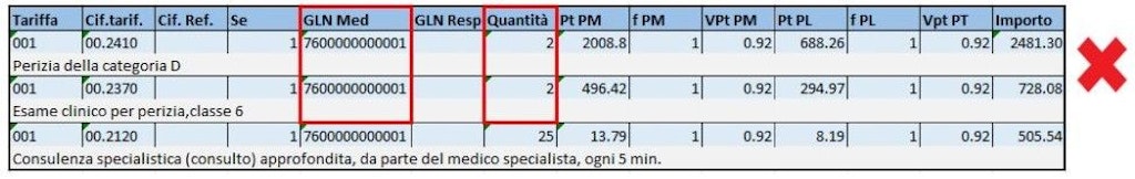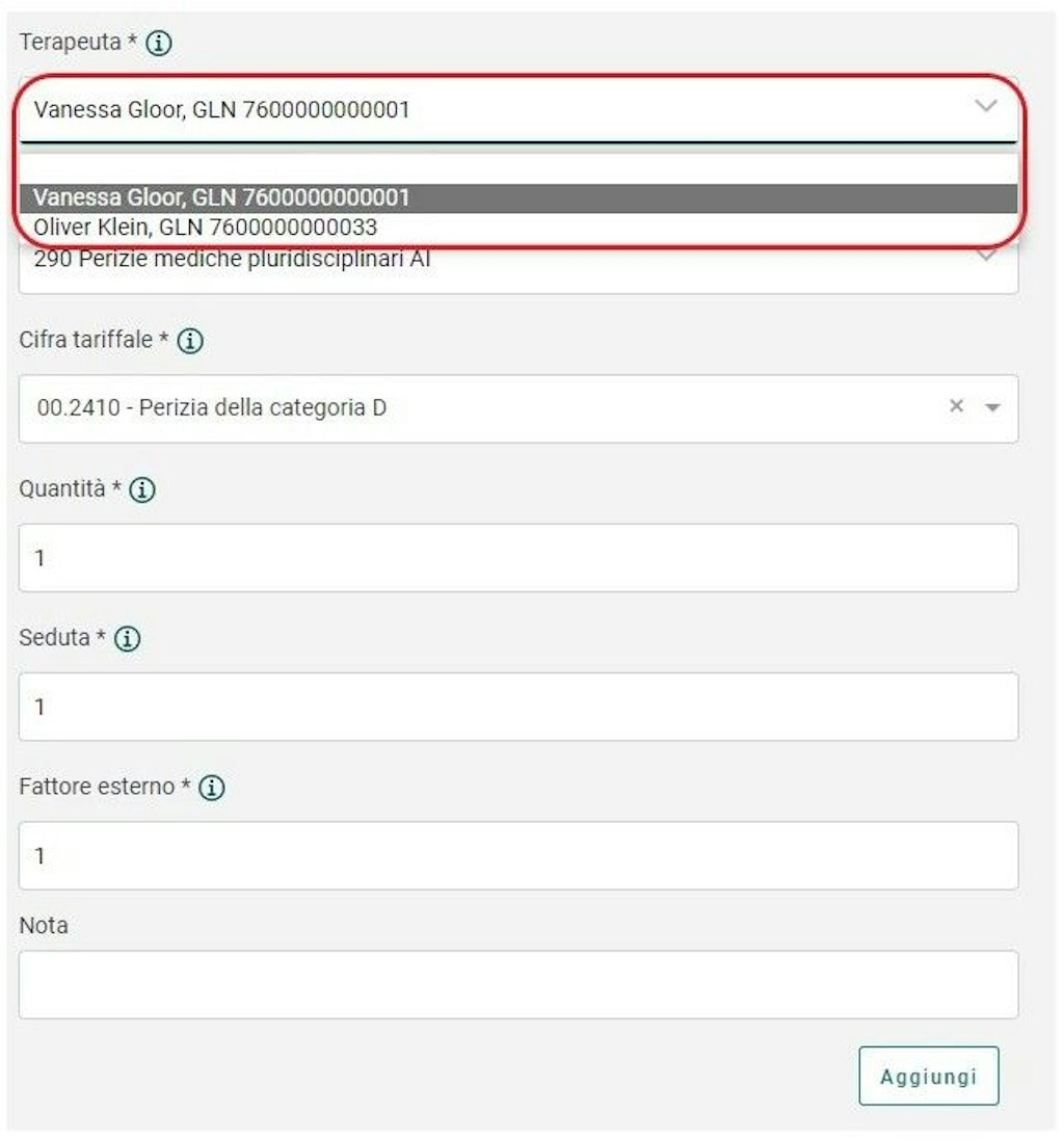 - Fra le prestazioni fatturate, per ogni perizia parziale nel campo «GLN MED» deve essere indicato il GLN del medico corrispondente. Questa persona fisica deve fare parte di una coppia di medici periti riconosciuti dall'UFAS.