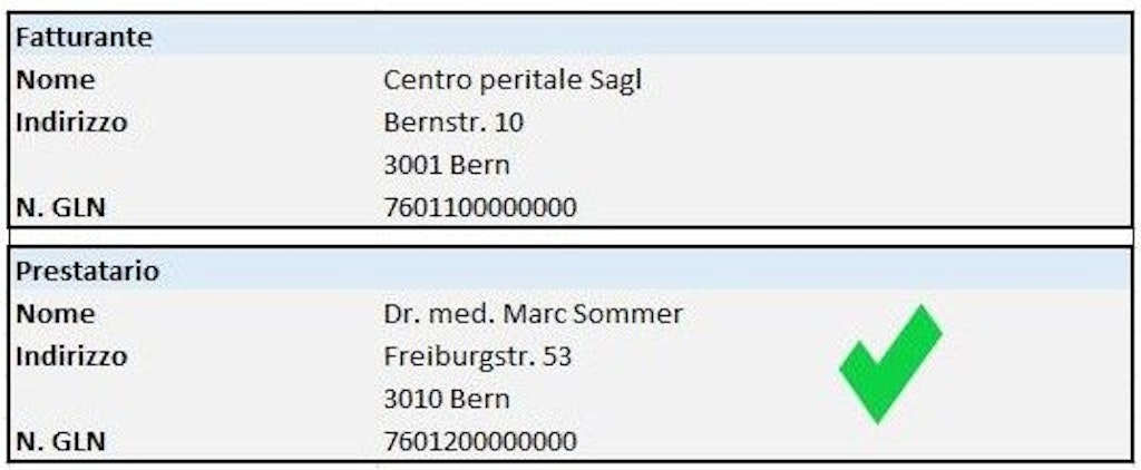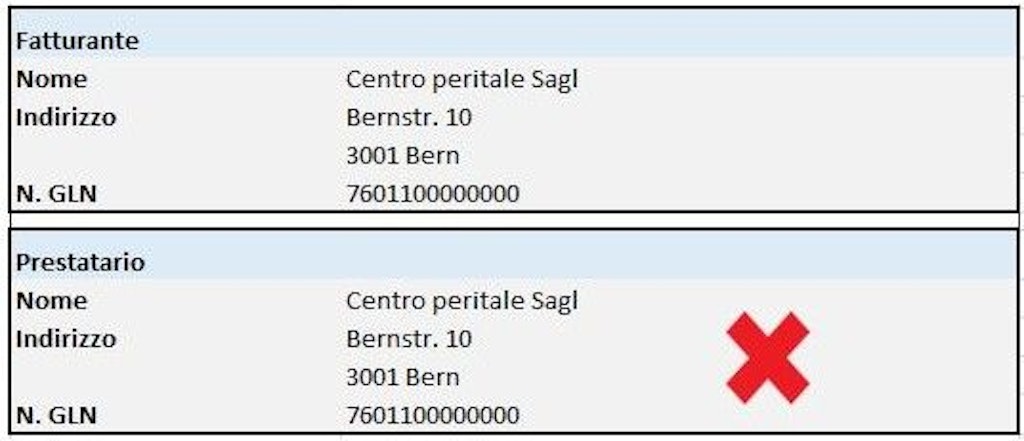 - Il fatturante può non corrispondere al prestatario e può essere una persona fisica o giuridica (medico, studio medico, clinica, ospedale, società, fondazione, servizi di incasso ecc.). Nella rubrica «Fatturante» si devono indicare nome e cognome (se necessario la ragione individuale o sociale), indirizzo e GLN del fatturante.