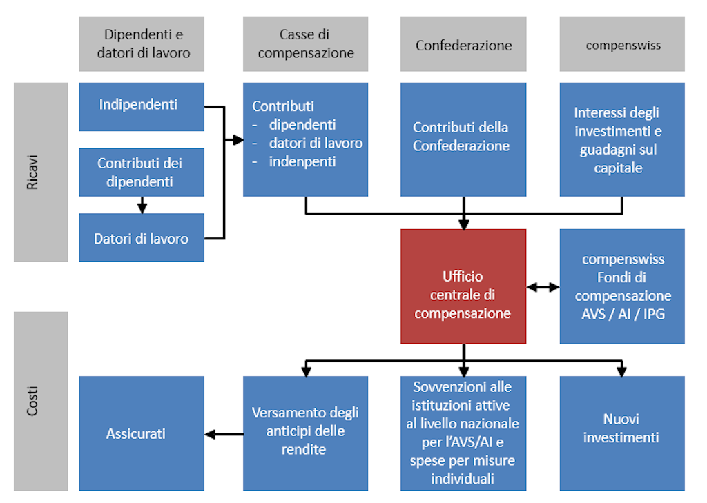 Le casse di compensazione hanno il compito d’incassare i contributi e/o di versare le prestazioni per le assicurazioni AVS/AI/IPG/AFA/AD. Una volta pagate le prestazioni federali di diritto diretto (ad esempio le indennità giornaliere dell’AI), versano quotidianamente il saldo alla Centrale di compensazione.