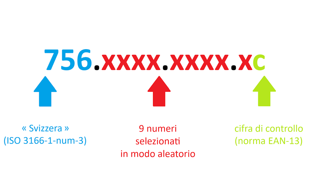 - Posizioni da 1 a 3: prefisso «756», codice del Paese che emette il numero (Svizzera) secondo lo standard ISO 3166-numerico.