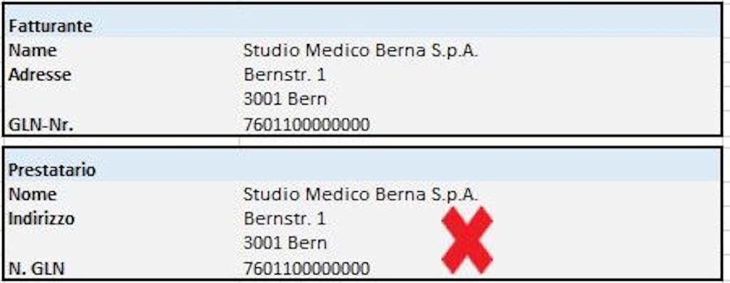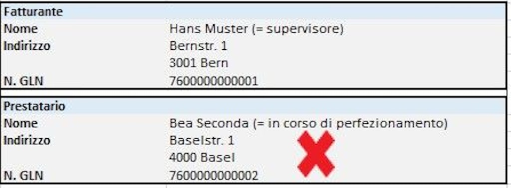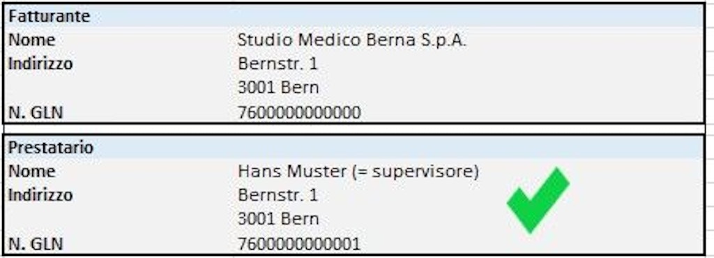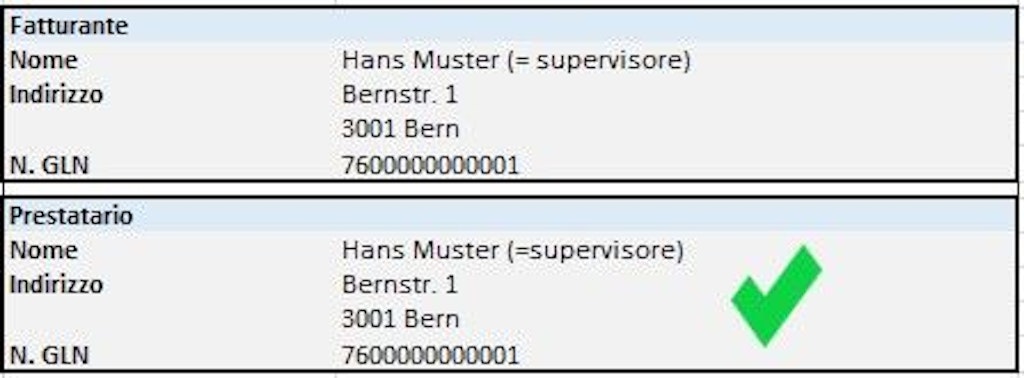 - Se lo specialista che li supervisiona è impiegato presso un'istituzione, quest'ultima fatturerà i servizi. In questo caso, il nome e il numero GLN del supervisore figurano esplicitamente su ogni fattura come «Prestatario». L'istituzione, invece, deve figurare come «Fatturante».