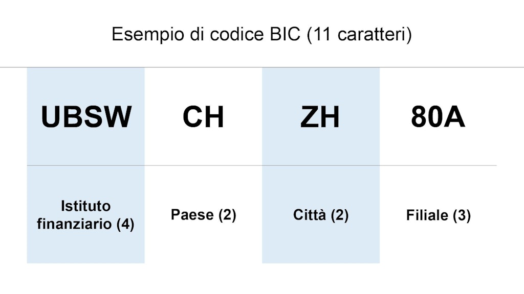 Il codice BIC ugualmente chiamato SWIFT è necessario per i pagamenti internazionali. È possibile richiedere questa informazione presso la propria banca. Il codice BIC è composto da 8 o 11 caratteri.
