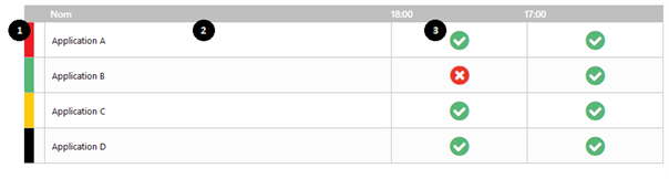 1. La couleur de la barre verticale à gauche du nom de l'application indique le statut actuel :